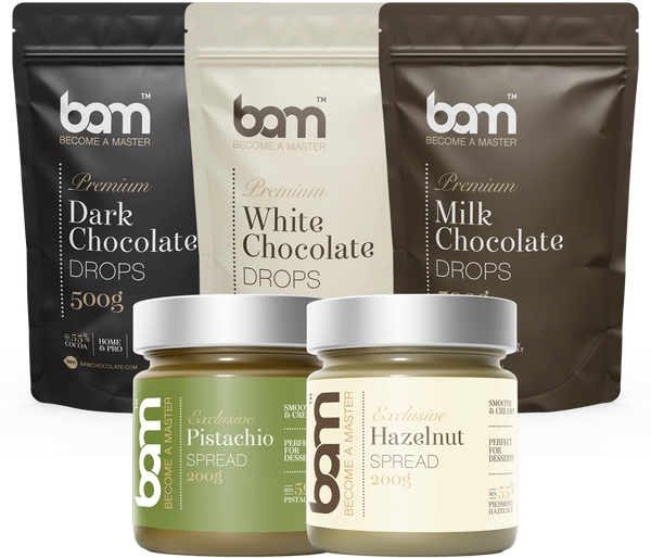 Súprava krémových náplní do cukroviniek BAM pozostáva z pistáciovej (200 g) a lieskovoorieškovej (200 g) nátierky. K nátierkam BAM patria mliečne (500 g), biele (500 g) a horké (500 g) čokoládové kvapky. Kombináciou krémovej bielej čokolády a pistáciovej nátierky možno vytvoriť sladkú krémovú náplň, ktorá sa môže kombinovať s trpkou chuťou čerstvých malín. A mliečna čokoláda s lahodnou lieskovoorieškovou nátierkou vytvára krémovú náplň pripomínajúcu chuť čokolád Kinder Bueno. Z horkej čokolády je najlepšia čokoládová pena , ktorá nepotrebuje takmer žiadne ďalšie prísady na dochutenie. S touto cukrárenskou súpravou môžete vytvoriť univerzálne krémové náplne, ktoré môžu ľahko prevziať hlavnú aj vedľajšiu úlohu vo vašom ďalšom dezerte. Výrobky neobsahujú GLUTÉN.