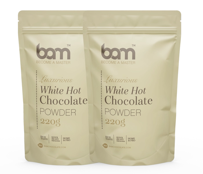 Biela horúca čokoláda BAM DUO je súprava dvoch bielych horúcich čokolád a je ideálnou voľbou pre všetkých milovníkov čokolády, ktorí si radi doprajú tradičné potešenie. Táto ohromujúca zmes horúcej čokolády je vyrobená z toho najkvalitnejšieho kakaa a ponúka dokonalú krémovosť a aromatickú príchuť. Dodáva sa v praktickom vrecúšku a spolu s dávkovacou lyžičkou, aby ste vždy vedeli, koľko horúcej čokolády použiť na prípravu nápoja.