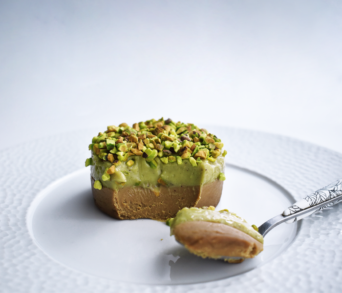 Keď obe formy stuhnú, opatrne odstráňte krúžky alebo silikónové formy. Koláčiky ozdobte nasekanými pistáciami a podávajte.