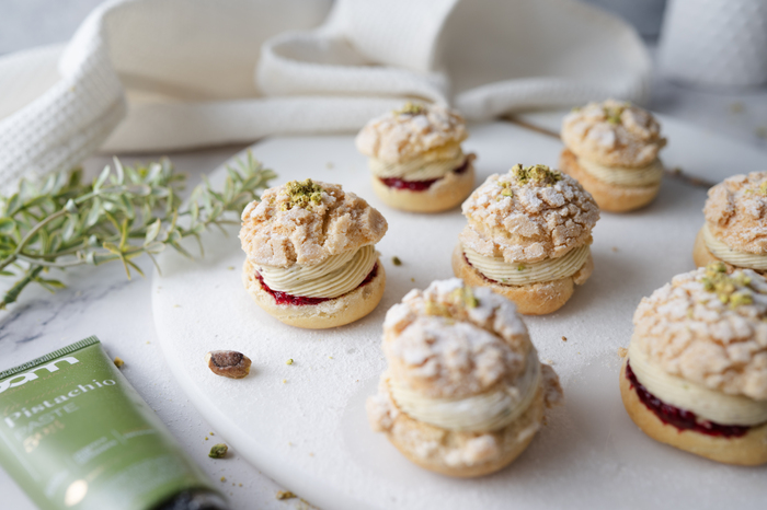 @bamchocolate.com Cream puffs White chocolate cream puffs that make an impression at first sight. Pistachio cream puffs combine light choux pastry, a crunchy craquelin topping, and a silky pistachio white chocolate cream. BAM white chocolate and pistachio paste create a rich yet balanced flavor, perfect for special occasions. ?Ingredients Craquelin topping • 35 g dark brown sugar • 40 g unsalted butter • 45 g all-purpose flour Choux pastry • 60 ml milk • 60 ml water • 55 g unsalted butter • 7 g white sugar • ½ tsp salt • 120 g all-purpose flour • 2–2.5 eggs Pistachio white chocolate cream • 300 g BAM white chocolate • 100 ml heavy cream • 2–2.5 tbsp pistachio paste • 30 g finely ground pistachios, optional Instructions Craquelin: Mix the sugar, butter, and flour into a smooth dough, roll it thin, and place it in the freezer until firm. Choux pastry and baking: Bring the milk, water, butter, sugar, and salt to a boil, then add the flour all at once and mix until a smooth dough forms. Let it cool slightly, then gradually mix in the eggs until glossy and elastic. Pipe the dough onto a baking tray, place craquelin discs on top, and bake until the puffs are well risen and golden. Let them cool. Cream and assembly: Pour hot cream over the BAM white chocolate, mix until smooth, and add the pistachio paste. Chill the cream well, then whip it and gently fold in the ground pistachios if desired. Cut the cream puffs, fill them with the cream, and close. Save for later and keep a recipe that always impresses. #creampuffs #pistachiocream #specialdesserts #bam #becomeamaster ♬ original sound - BAM (Become A Master)