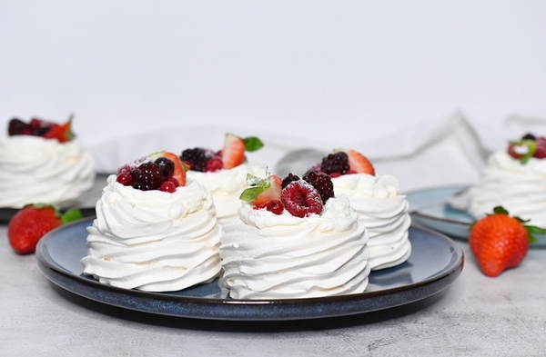 Tento koláč poteší aj tých najnáročnejších gurmánov. Skladá sa z chrumkavej bielkovej kôrky, jemného stredu, šľahačky a množstva čerstvých bobúľ. Vyžaduje si trochu opatrnosti a viac času na prípravu, pretože teplota pečenia musí byť nižšia, ak má zostať snehobiely. Ja som robila porciované torty, pretože ich mám radšej, ale ingrediencie môžete použiť na prípravu jednej väčšej torty. Prísady v recepte vystačia na 6 malých koláčov alebo jeden veľký koláč s priemerom 20 cm.