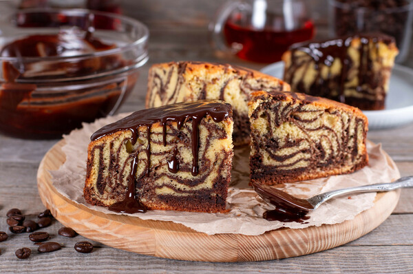 Pomocou veľkej polievkovej lyžice začnite striedavo hádzať guľky cesta do pripravenej formy v šachovnicovom vzore, kým sa zmes nespotrebuje. Pomocou špajle premiešajte obe zmesi, aby sa vytvoril mramorový efekt, pričom dbajte na to, aby ste to nepreháňali. Na vrch nasypte čokoládové lupienky a espresso.