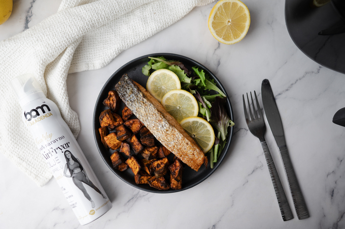 Pečený losos a sladké zemiaky z fritézy sú ideálnou voľbou pre tých, ktorí chcú vyvážené jedlo bez dlhej prípravy a prebytočného tuku. Sladké zemiaky sa vo fritéze pekne opečú a v strede zostanú mäkké, zatiaľ čo losos sa upečie rovnomerne, takže je zvonka ľahko opečený, ale vo vnútri stále šťavnatý. Kľúčovú úlohu v tomto procese zohráva olej zo vzduchovej fritézy BAM x Patricija Pangeršič, ktorý umožňuje rovnomernú prípravu a zvýrazňuje prirodzené chute surovín.
